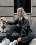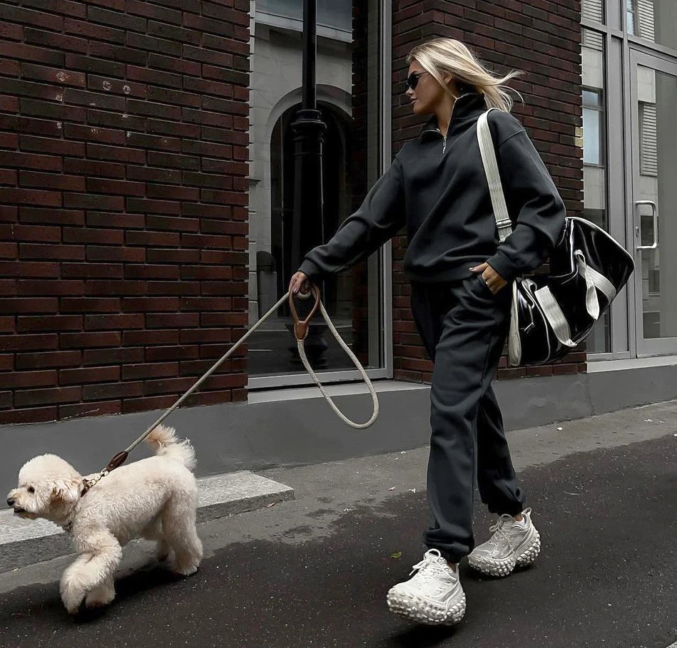 A comfortable and stylish two-piece set designed for women, perfect for autumn and winter casual sportswear. Featuring a pullover top with turn-down collar, embroidery details, and functional pockets, paired with full-length high-waist pants with elastic closure. Made from a cotton-polyester blend, this set offers breathability, durability, and a relaxed loose fit.