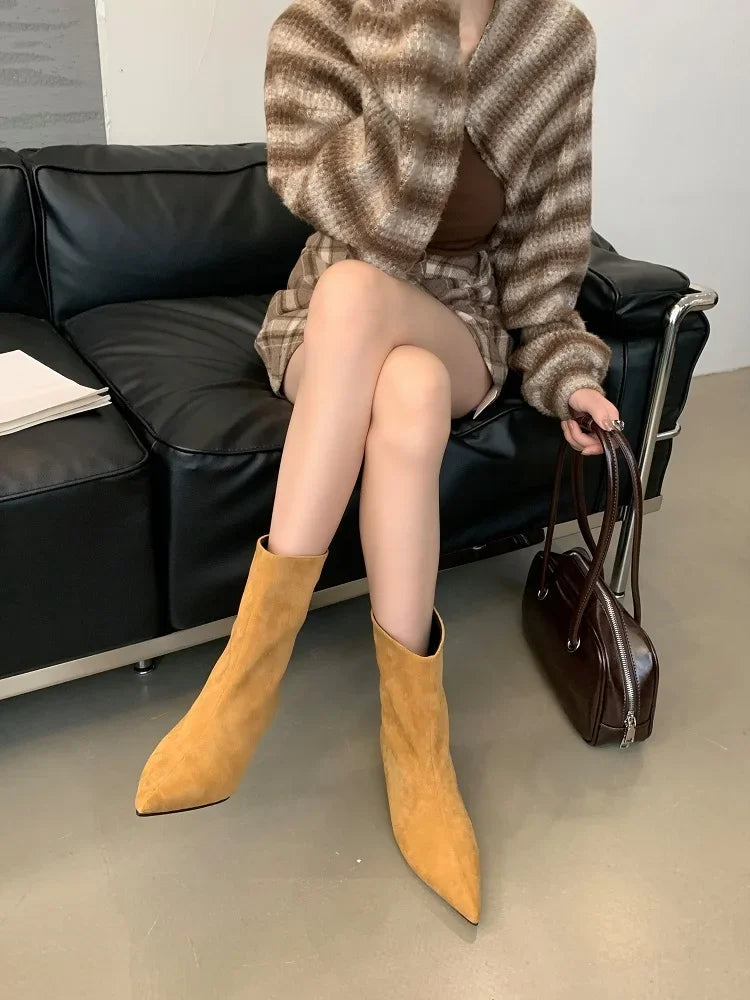 Perfect for pairing with dresses, skirts, or slim-fit trousers. These boots add height and sophistication, making them ideal for parties, evening outings, or chic everyday wear. Their pointed toe and thin heel design give a sleek, fashionable silhouette.