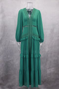 Overview: A sophisticated and versatile floor-length dress designed for women who appreciate timeless elegance. Featuring a flattering V-neckline, tiered detailing, and lantern sleeves, this piece blends comfort with chic style. Perfect for all seasons, it’s ideal for commuting, streetwear, or casual elegant occasions.