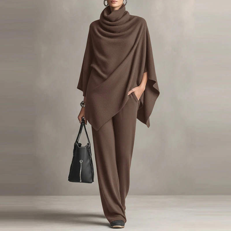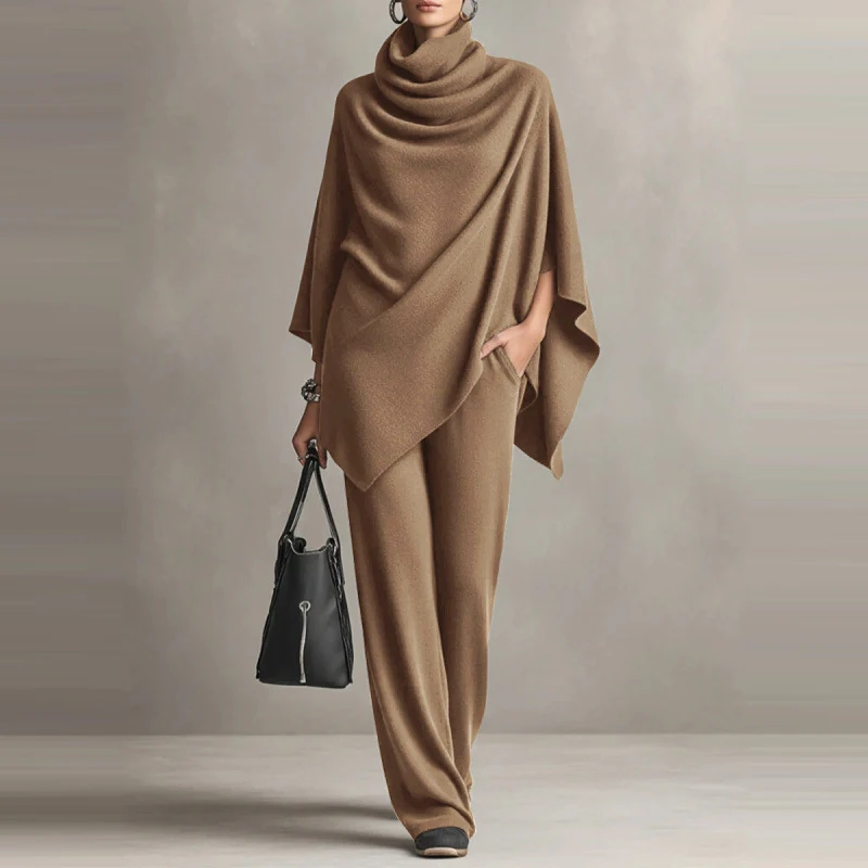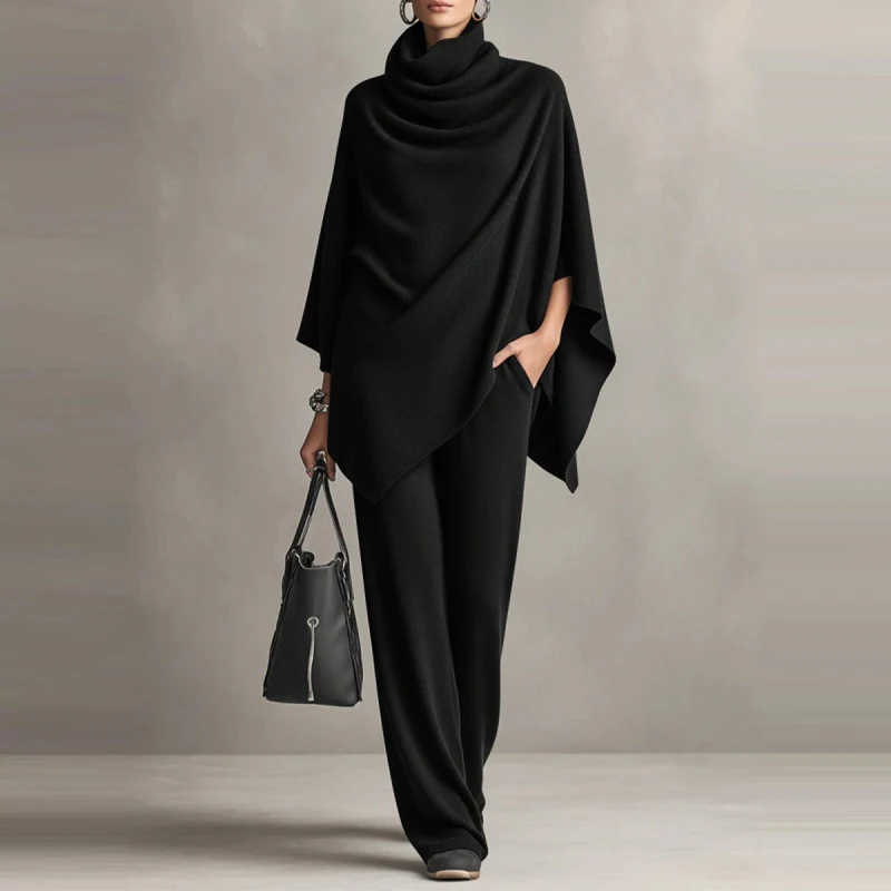 Fashion Pile up Collar Cape Tops & Long Pants Sets Women's Casual Long Sleeve Solid 2Pc Outfits Elegant Draped Wide Legger Suit