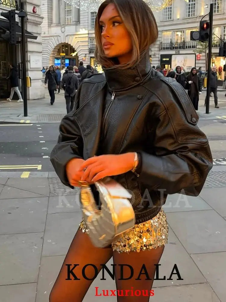 KONDALA Casual Chic Black Leather Jackets Women Long Sleeve Buttons Elastic Oversized Coats Fashion 2026 Spring Streetwear Coats