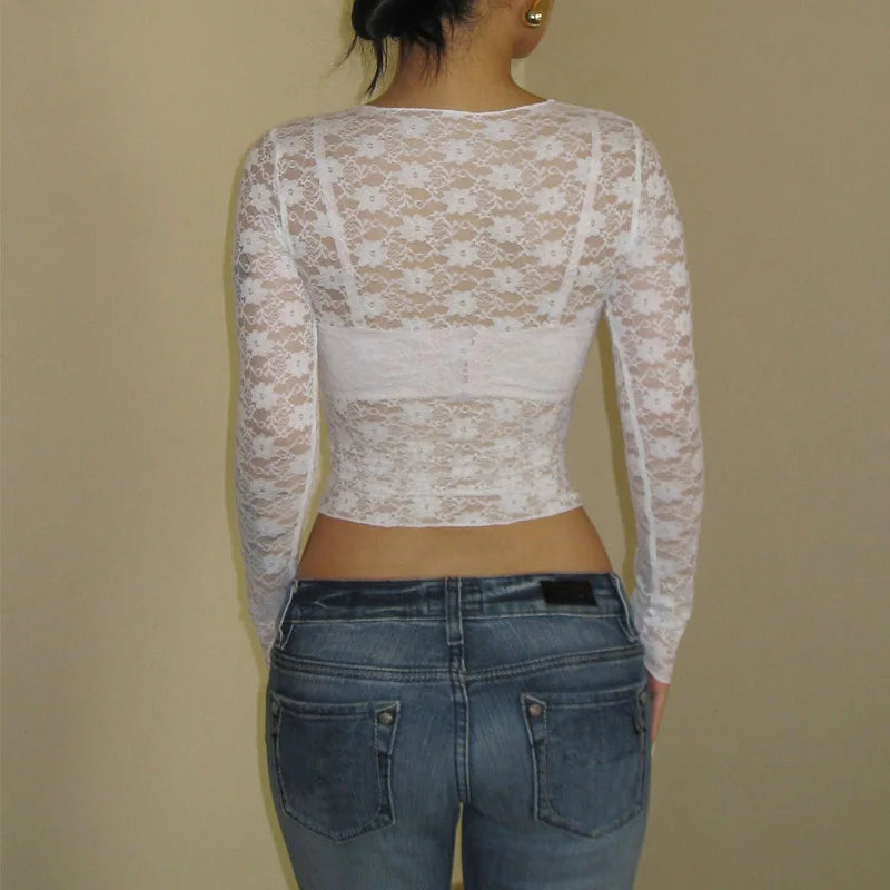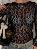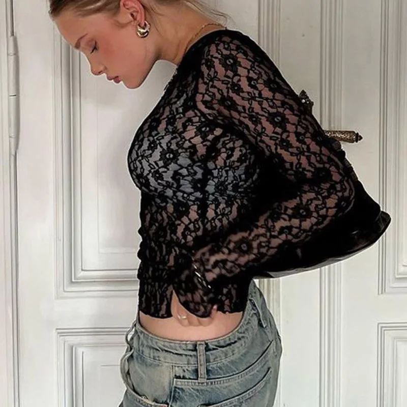 Long Sleeves See Through Lace Crop Top Solid Sexy Bodycon T-Shirt For Women Party Club Autumn Winter Clothes