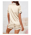 A versatile and comfortable pajama set designed for women, suitable for all seasons. Made from a polyester-elastane blend with tatting weave, this set features a short-sleeved top with a turn-down collar and matching shorts. With its solid color design and breathable fabric, it offers a simple yet stylish look for everyday homewear.