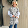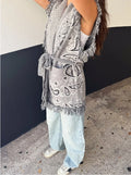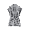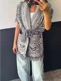 Women's Print Fringe Knitted Long Coat Fashion Sleeveless Tie Waist Pocket Cardigan Sweater Lady 2025 Autumn Casual Outerwear