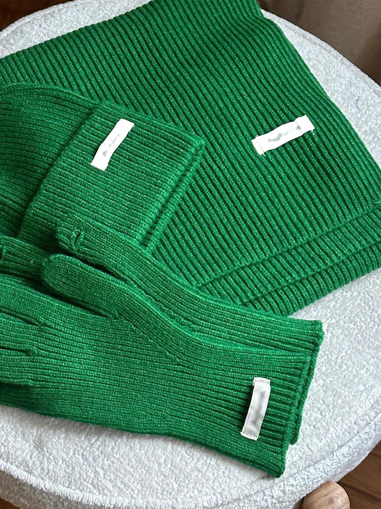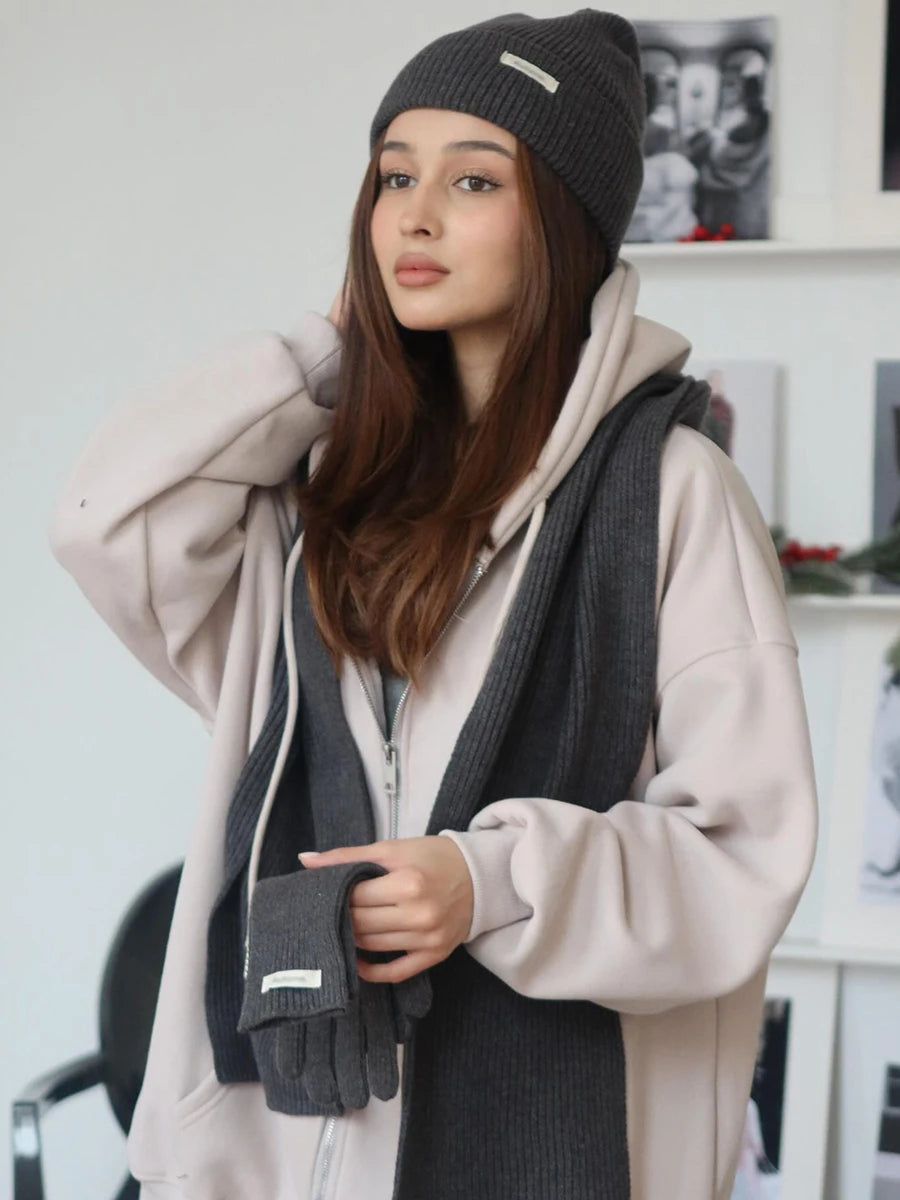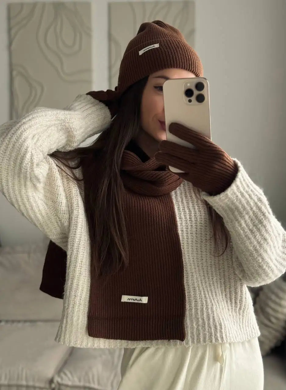 A stylish and cozy accessory set designed for women, combining fashion with functionality. This set includes a scarf, hat, and gloves made from a soft knit blend of spandex, acrylic, and nylon. Lightweight yet warm, it’s perfect for adding a chic touch to winter outfits.